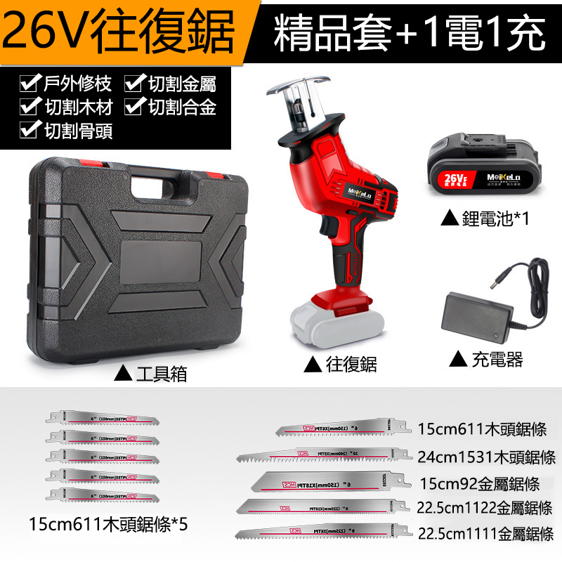 15分鐘前【德國精工鋰電鋸】鋼、鐵、磚頭、木材,統統都能鋸!續航久、充電快,方便攜帶,一機多用 - 26V德國精工往複鋸(機頭+1充2電)贈塑箱+5鋸條+大/5鋸條NT$2590