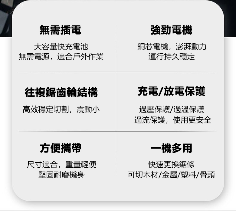 4分鐘前【德國精工鋰電鋸】鋼、鐵、磚頭、木材,統統都能鋸!續航久、充電快,方便攜帶,一機多用 - 26V德國精工往複鋸(機頭+1充2電)贈塑箱+5鋸條+大/5鋸條NT$2590