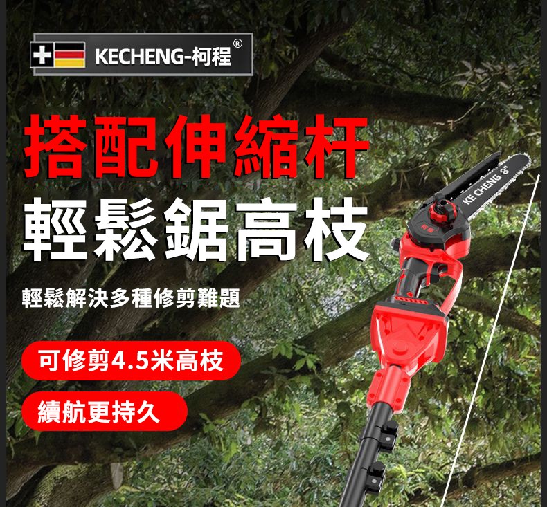 2分鐘前果農修枝好幫手】德國KECHENG進口電動伸縮鋰電鋸-5.5米高枝輕鬆鋸!動力強勁,果園工作不費力! - 可鋸4米伸縮桿+6吋鋰電鋸+修枝剪【雙電】NT$4690
