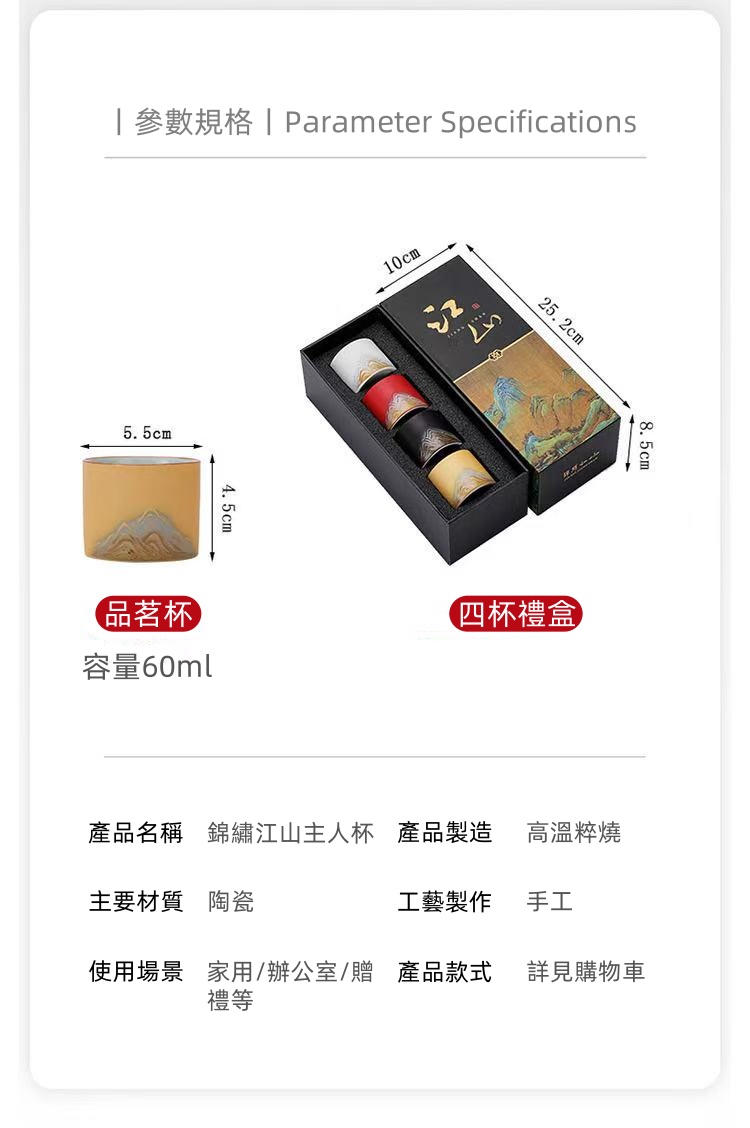 2分鐘前【陶作坊再造支持募資活動】台湾陶藝大師林榮國封窯之作丨錦繡江山陶瓷茶具組,杯側繪有錦繡江山圖,寓意“背有靠山、前程似錦”祝福每一個客人“事業穩固,財源廣進” - 【好物分享送禮】封窯之極.林榮國大師珍藏茶具組 2入組NT$1480