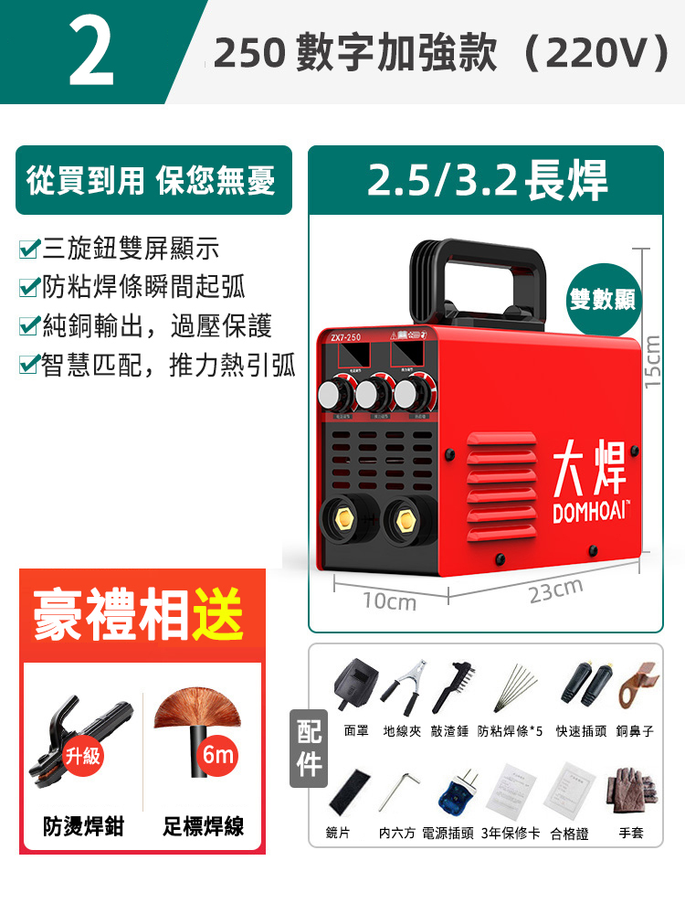 4分鐘前業內焊機領軍品牌【德國DOMHOAI】全新二代數字化電焊機,瞬間起弧,長焊4.0焊條 - 【250-220V】數字加強款+基礎套餐