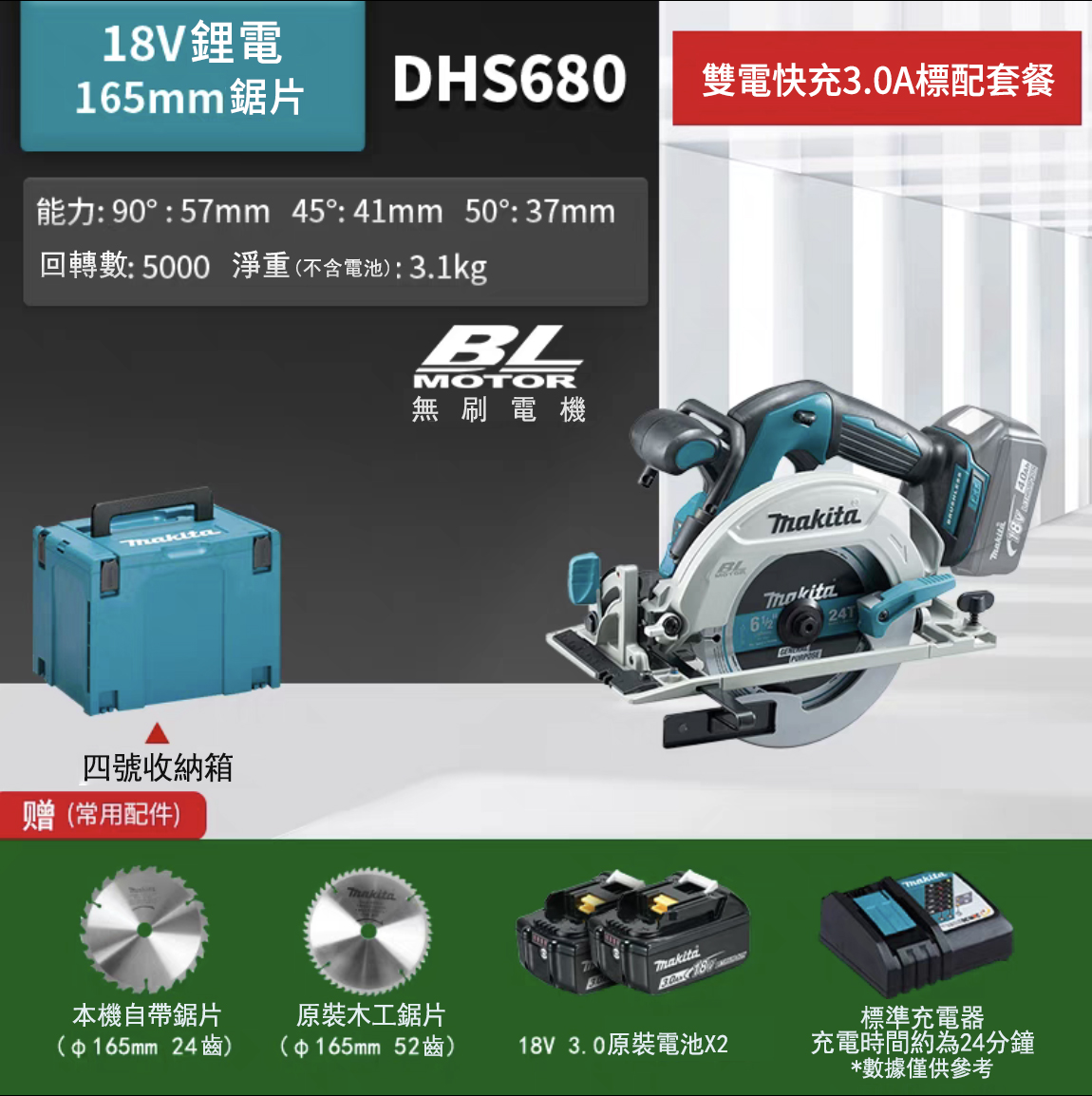 半小時前「牧田/Makita」DHS680 18V 4寸、7寸 多功能鋰電園鋸 大容量鋰電池 馬力強勁切割不卡殼 - DHS680【7寸】雙電3.0Ah電池+兩鋸片